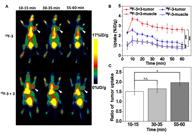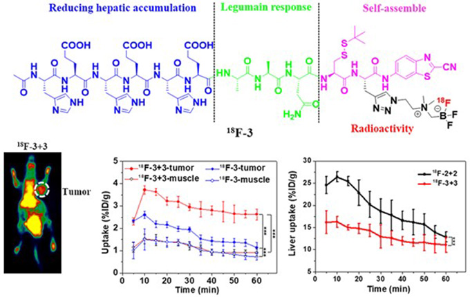 在上述實驗基礎上,研究團隊還進行了引入標記和共注射策略的優(yōu)化實驗:通過在探針18F-3中引入三組組氨酸-谷氨酸親水肽鏈(HE)3標記,顯著減少肝臟蓄積,而不影響腫瘤攝取;采用共注射策略(18F-2 + 2和18F-3+ 3)使腫瘤攝取顯著增加,信噪比顯著提高。結果表明,探針18F-3對監(jiān)測天冬酰胺內肽酶在腫瘤中的表達水平具有良好的特異性與靈敏度,對天冬酰胺內肽酶過表達相關的疾病在早期發(fā)現與療效監(jiān)測方面具有較好的應用潛力。(創(chuàng)新藥物研究中心)