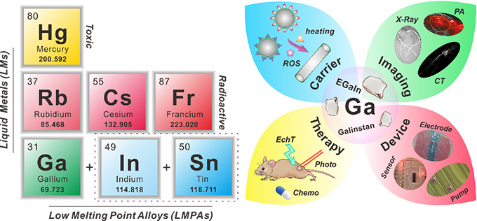 鎵(67Ga,68Ga)是核醫(yī)學SPECT和PET常用的金屬核素,可助力疾病的精準診治,加速新藥研發(fā)進程,臨床應用廣泛。此外,基于鎵及其合金的液態(tài)金屬還具有良好的導電性、導熱性和機械性能,同時具備較低的粘度和很好的流動性,近年來在材料科學與工程、能源催化、生物醫(yī)學等諸多領域引起廣泛關注。本篇綜述介紹了液態(tài)金屬的基本化學、物理性能,重點總結了其在形狀可調、毒理學、功能修飾、磁性能、自修復性能方面的特性,并詳細論述了其在藥物載體、分子影像(X光、CT、光聲成像)、癌癥治療(光熱、電化學療法)和生物醫(yī)學器件(生物傳感器、微流泵、神經連接器、植入式電極)中的應用,同時也對其發(fā)展機遇和面臨挑戰(zhàn)做出了展望。該研究得到了國家重大新藥專項(2017ZX09304021)、國家自然科學基金(21504034,31671035)和江蘇省醫(yī)學創(chuàng)新團隊(CXTDA2017024)等項目的資助。(分子影像中心實驗室)