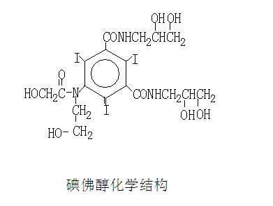 碘佛醇是優(yōu)秀的非離子型造影劑,具有兩點明顯優(yōu)于其他非離子型造影劑的化學(xué)結(jié)構(gòu)特點,即六個親水的羥基(OH)圍繞苯環(huán)上的碘原子均勻分布和分子結(jié)構(gòu)中沒有疏水的甲基(CH3)存在。碘佛醇的這兩個結(jié)構(gòu)特點使造影劑分子中的碘原子及脂溶性苯環(huán)被更有效地屏蔽,避免它們與人體組織接觸,大大降低了造影劑的化學(xué)毒性和副反應(yīng)的發(fā)生,在臨床上受到了很大的重視。