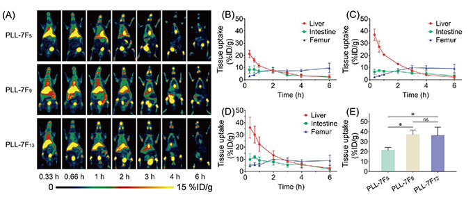 進一步研究發現,放射性核素18F可以通過鹵素置換反應在氟化PLL(F-PLL)上進行標記,標記后不改變其化學結構及生物活性。PET顯像顯示,氟化修飾的PLL在肝臟中可以快速清除,其肝臟攝取率隨氟鏈修飾數量從5增加到9而有所升高,但是當氟鏈修飾數量分別達到9和13的時候肝臟攝取率幾乎沒有差別。