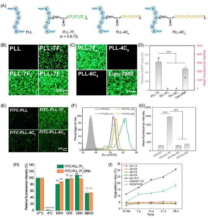 我所楊敏研究員、王辛宇副研究員與華東師范大學程義云教授等合作,選擇一種天然存在、低分子量(約4000Da)、可生物降解的聚合物ɛ--L-賴氨酸(PLL)作為多肽基因載體,對其進行氟化修飾得到氟化PLLF-PLL),能夠將PLLEGFP質粒的轉染效率提升至60%以上,明顯優于商品化轉染試劑Lipo2000等。團隊以烷基鏈修飾的PLL作為對照材料進行對比研究后發現,氟化PLL的轉染效率提高主要得益于氟效應而非其疏水性。