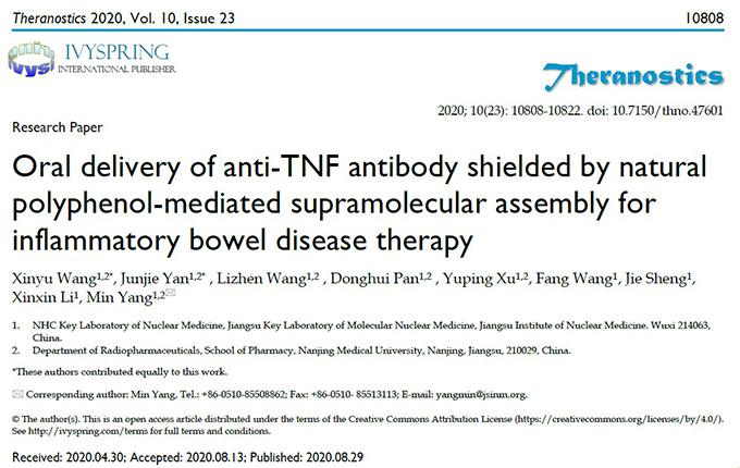 Wang Xinyu, Yan Junjie, Wang Lizhen, Pan Donghui, Xu Yuping, Wang Fang, Sheng Jie, Li Xinxin, Yang Min*. Oral delivery of anti-TNF antibody shielded by natural polyphenol-mediated supramolecular assembly for inflammatory bowel disease therapy. Theranostics, 2020, 10(23): 10808-10822.