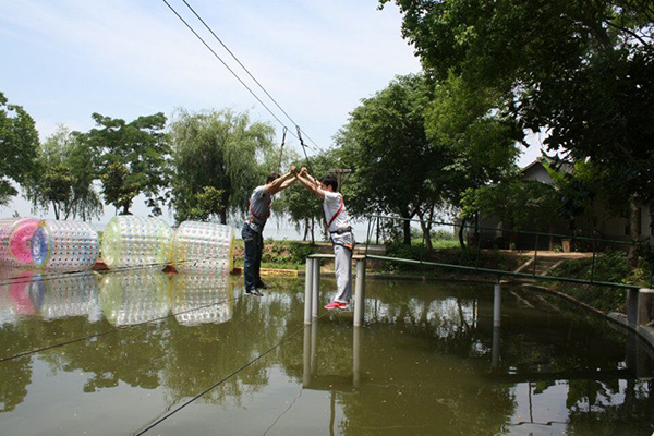燦爛的晴天,大家的心情也格外的好,經(jīng)過一系列熱身活動后,隊員被隨機分為兩隊,通過集體討論,確定了各自的隊名、隊長、隊花、隊旗、隊歌和口號。在隨后的拓展過程中,各隊隊員也都拿出了十足的勇氣和良好的精神狀態(tài),在歡聲笑語中,通過個人挑戰(zhàn)、通力合作,圓滿完成了空中斷橋、水上鋼絲和龍舟比賽這三個項目。